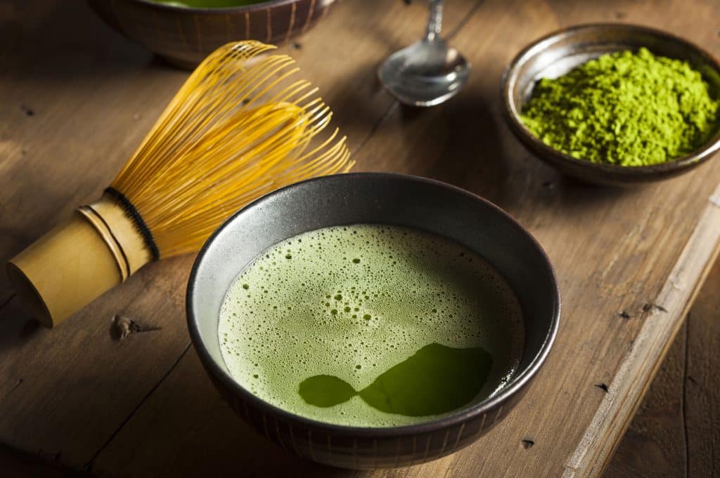 La poudre du matcha est traditionnellement dissoute dans l’eau chaude afin d’obtenir un thé vert intense.