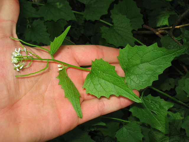 L'alliaire officinale est une plante herbacée bisannuelle ou annuelle de la famille des Brassicaceae, atteignant 30 à 90 cm de hauteur. Elle se caractérise par ses feuilles caduques, alternes et pétiolées, de forme réniforme à cordée, au bord dentelé. Les feuilles dégagent une odeur d'ail caractéristique lorsqu'elles sont froissées, ce qui explique son nom vernaculaire. Originaire d'Europe, du Moyen-Orient et d'Asie centrale, cette espèce s'est naturalisée dans de nombreuses régions tempérées. Elle produit de petites fleurs blanches groupées en grappes, suivies de siliques allongées. L'alliaire apprécie les environnements semi-ombragés et les sols humides, notamment les fossés et les lisières forestières où elle forme parfois des populations denses.