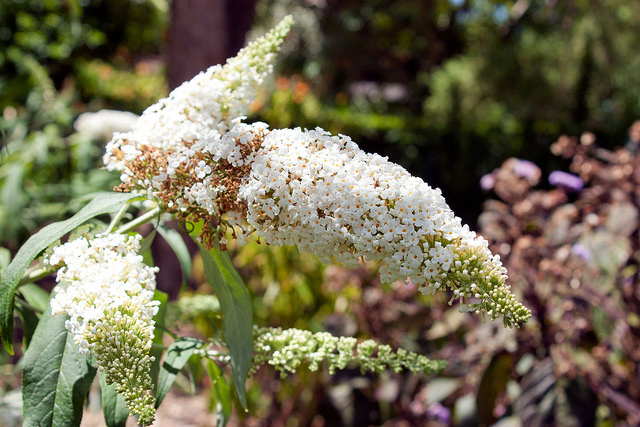 Buddleia davidii, communément appelée Arbre aux papillons, est un arbuste caduc de la famille des Buddleiaceae, originaire des régions montagneuses du centre et de l'ouest de la Chine. Cet arbuste peut atteindre 2 à 4 mètres de hauteur et présente des feuilles lancéolées, allongées et grisâtres. Son port étalé et léger lui confère une silhouette gracieuse. La principale caractéristique distinctive de cette espèce réside dans ses inflorescences densément fleuries : des grappes pyramidales et terminales, composées de petites fleurs tubulaires très parfumées, déclinées en blanc, bleu, rose ou violet selon les variétés. Ces fleurs s'épanouissent abondamment de juillet à octobre, créant des masses colorées très ornementales dans le paysage.