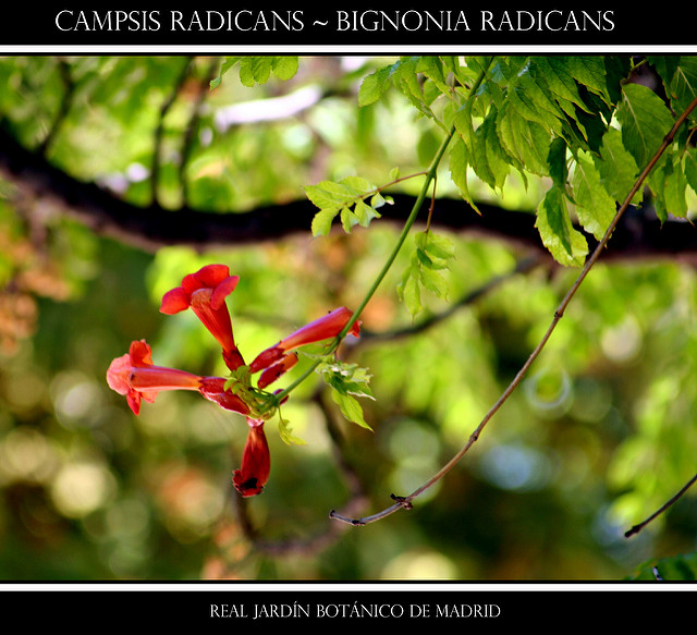Campsis radicans, communément appelée Bignone, est une plante grimpante vivace appartenant à la famille des Bignoniaceae. Originaire du sud-est des États-Unis, elle se caractérise par un port volubile capable d'atteindre 8 à 10 mètres de hauteur. Ses tiges munies de petites vrilles adhésives lui permettent de s'accrocher fermement aux supports. Le feuillage, caduc et composé de folioles lancéolées, offre une teinte vert vif avant de disparaître en hiver. La plante est surtout remarquable pour ses fleurs spectaculaires en forme de trompette, de couleur rouge-orangé intense, produites généreusement de juillet à octobre. Ces fleurs tubuleuses, longues de 5 à 8 centimètres, émergent en grappes terminales et constituent le principal attrait ornemental de l'espèce.