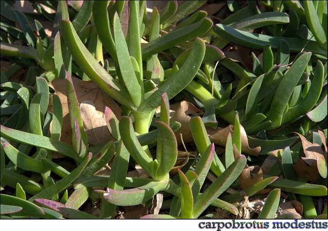 Carpobrotus modestus joue un rôle important dans les écosystèmes côtiers et semi-arides où elle est établie. Ses fleurs attirent des pollinisateurs variés, notamment les abeilles et certains papillons, contribuant à la biodiversité locale. En tant que plante succulente, elle stabilise les sols meubles et prévient l'érosion côtière, offrant un habitat refuge aux petits invertébrés. L'espèce est bien adaptée aux stress climatiques et ne présente pas de menaces majeures. Son introduction en zones méditerranéennes a parfois posé des questions d'équilibre écologique, bien qu'elle reste généralement bien intégrée. Elle représente une option précieuse pour la végétalisation de zones dégradées dans le contexte du réchauffement climatique.