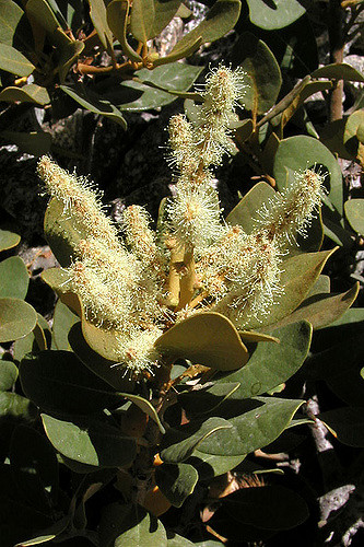 Chrysolepis sempervirens, communément appelé châtaignier doré persistant, est un arbuste appartenant à la famille des Fagacées. Native des régions montagneuses de Californie et d'Oregon, cette espèce se distingue par son feuillage persistant vert foncé aux reflets dorés caractéristiques du genre Chrysolepis. L'arbuste atteint généralement 2 à 4 mètres de hauteur avec un port compact et arrondi. Ses feuilles lancéolées présentent une face supérieure brillante et une face inférieure couverte d'écailles dorées distinctives. La floraison estivale produit de petites fleurs verdâtres regroupées en chatons, suivies de fruits épineux contenant une amande comestible. Cette espèce prospère dans les milieux forestiers ouverts et rocheux.