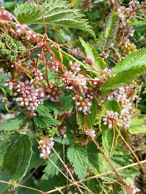 Cuscuta europaea, communément appelée Cuscute d'Europe, est une plante grimpante parasitaire appartenant à la famille des Convolvulacées. Dépourvue de chlorophylle, elle se distingue par ses tiges filiformes de couleur rouge à orange formant des enchevêtrements denses sur ses hôtes. Cette plante annuelle produit de petites fleurs blanches et délicates pendant l'été. Contrairement aux plantes classiques, elle possède un système de racines modifiées appelées suçoirs qui pénètrent les tissus des plantes hôtes pour en extraire l'eau et les nutriments. Originaire d'Europe, elle se propage naturellement sur les cultures et les plantes sauvages, particulièrement sur le houblon, le lin et diverses herbacées.