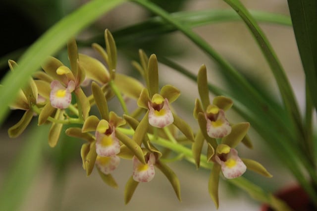 Cymbidium floribundum est une orchidée vivace de la famille des Orchidaceae, originaire des régions tropicales et subtropicales d'Asie du Sud-Est. Cette espèce se distingue par son port en touffe compacte avec des feuilles persistantes, longues et linéaires, formant des pseudobulbes caractéristiques. Elle produit des inflorescences abondantes composées de petites fleurs aux teintes rouges et marron, d'où son épithète « floribundum » signifiant « très fleuri ». La plante atteint généralement 30 à 60 cm de hauteur. Dans son habitat naturel, elle pousse comme épiphyte ou lithophyte sur les arbres et rochers des forêts humides, bénéficiant d'une bonne circulation d'air et d'une luminosité filtrée.
