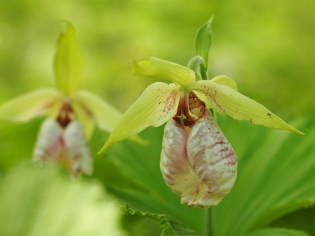 Cypripedium japonicum, appelé Sabot de Vénus japonais, est une orchidée vivace de petite à moyenne taille originaire des forêts tempérées du Japon, de Chine et de Corée. Cette plante herbacée caractérisée par son port compact atteint 20 à 40 cm de hauteur. Elle se distingue par ses feuilles lancéolées, d'un vert tendre, disposées en rosette basale, avec un feuillage caduc disparaissant après la floraison. La fleur typique des Cypripedium se reconnaît par son labelle transformé en « sabot » de couleur rose pâle à violet, contrastant avec les sépales et pétales jaune-vert striés de pourpre. Cette orchidée terrestre pousse naturellement dans les milieux forestiers humides et ombragés, souvent près des sources ou sur les versants montagneux bien drainés.
