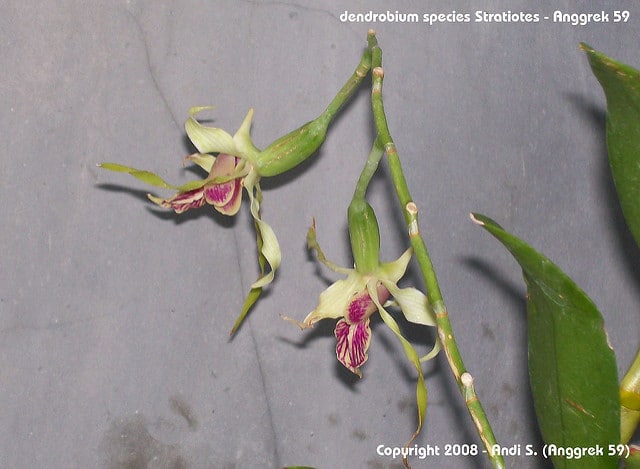 Dendrobium stratiotes prospère en mi-ombre, reproduction fidèle de son habitat épiphytique naturel. Un arrosage moyen et régulier est essentiel, en maintenant un substrat bien drainé composé d'écorce et de sphagnum. Cette orchidée tendre ne tolère pas les températures froides ; elle préfère des conditions tempérées à chaudes avec une bonne ventilation. Floraison abondante en juin-juillet favorisée par une période de repos hivernal plus frais. Le rempotage se pratique tous les deux à trois ans, de préférence après la floraison. Fournir une humidité ambiante élevée et éviter les courants d'air froids garantissent une croissance saine et une floraison régulière.
