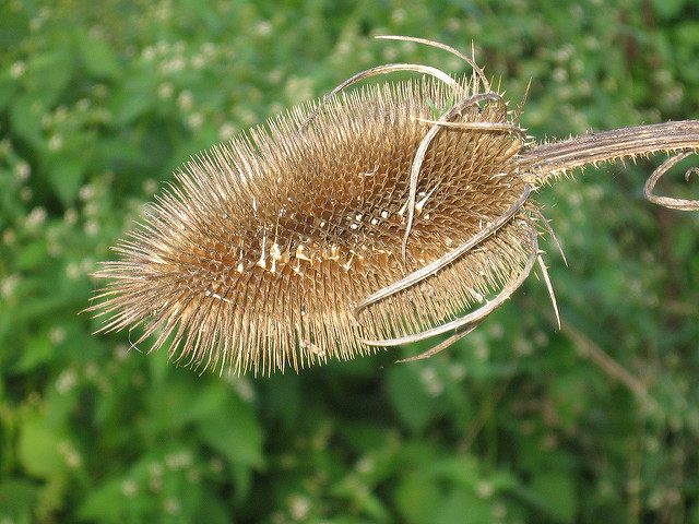 La cardère à foulon (Dipsacus sativus) est une plante bisannuelle de la famille des Caprifoliaceae, atteignant 1 à 2 mètres de hauteur. Elle se caractérise par des tiges robustes et épineuses, dotées de feuilles opposées soudées à la base, formant des cupules retenant l'eau de pluie. Les inflorescences sont des capitules ovoïdes de 4 à 8 cm, composés de petites fleurs rose pâle s'épanouissant progressivement de la base vers le sommet. Originaire d'Europe du sud et d'Asie occidentale, cette plante préfère les zones tempérées et les habitats perturbés. Son port dressé et ses épines acérées la rendent facilement reconnaissable dans la flore sauvage comme dans les cultures.