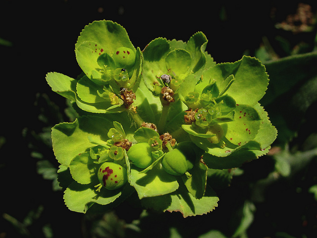 L'Euphorbe réveille-matin est une plante herbacée annuelle appartenant à la famille des Euphorbiaceae, caractérisée par sa petite taille (20 à 50 cm) et son port érigé et ramifié. Elle possède des feuilles alternes, obovales et finement dentelées, disposées en rosette basale puis étalées le long des tiges. Les fleurs, regroupées en ombelles jaune-verdâtre à jaune pâle, s'épanouissent de mai à octobre. Originaire d'Europe, cette plante rudérale colonise les terrains cultivés, les friches et les zones perturbées. Son nom vernaculaire « réveille-matin » évoque la sensibilité de ses fleurs au soleil, qui s'ouvrent à l'aube et se ferment à la tombée du jour. Toutes ses parties contiennent une sève laiteuse toxique caractéristique du genre Euphorbia.