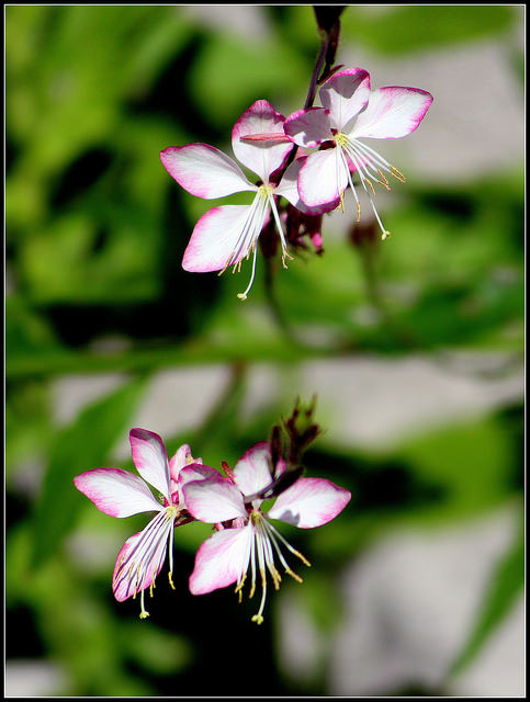 Gaura lindheimeri, originaire du Texas et du Mexique, est une vivace herbacée appartenant à la famille des Onagraceae. Elle se caractérise par un port buissonnant et aéré, atteignant 60 à 90 cm de hauteur. Les tiges sont fines et ramifiées, portant des feuilles lancéolées, vert-gris, au feuillage caduc. La plante produit de délicates fleurs en épis lâches, bicolores rose et blanc, qui s'épanouissent successivement de juin à octobre, créant un effet de légèreté et de mouvement dans le jardin. Les fleurs, petites et papilionacées, sont remarquablement décoratives et persistantes, offrant une longue période de floraison. Son habitat naturel comprend les régions semi-arides et les prairies, ce qui explique sa grande rusticité et sa capacité à prospérer dans des conditions difficiles.