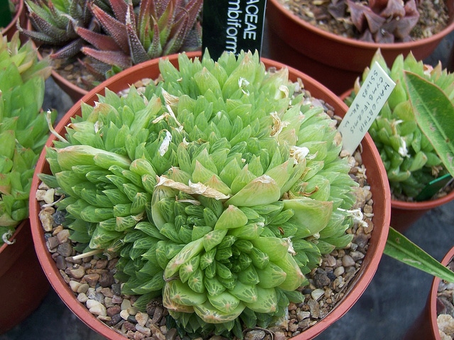 Haworthia cymbiformis est une petite plante succulente vivace appartenant à la famille des Aloaceae. Originaire d'Afrique du Sud, elle forme une rosette compacte de feuilles charnues, pointues et translucides, disposées en forme de navire (d'où le nom « cymbiformis » signifiant en forme de bateau). Elle mesure généralement 5 à 10 cm de hauteur et s'étend sur 10 à 15 cm de diamètre. Les feuilles vert pâle présentent des bandes blanches transversales caractéristiques, particulièrement visibles en lumière. C'est une plante au port très ornemental, adaptée aux environnements secs et arides. Elle se distingue par sa capacité à prospérer dans des conditions minimales d'arrosage, typique des succulentes du genre Haworthia qui colonisent les zones rocheuses et semi-désertiques d'Afrique australe.
