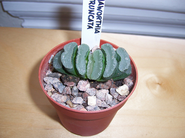 Haworthia truncata est une petite plante succulente vivace appartenant à la famille des Aloaceae, originaire d'Afrique du Sud. Cette espèce se distingue par ses feuilles charnues disposées en rosette compacte, de forme caractéristique tronquée ou aplatie au sommet, d'où provient son nom latin. Les feuilles sont gris-vert, souvent marquées de bandes translucides horizontales, et mesurent généralement 2 à 4 cm de longueur. La plante forme des touffes denses ne dépassant pas 5 à 8 cm de hauteur, ce qui la rend idéale pour les petits espaces. Elle fleurit en juillet, août et octobre avec de petites fleurs blanches réunies en épis fins et discrets. Son port compact et sa grande longévité en font une espèce appréciée des collectionneurs de plantes succulentes.