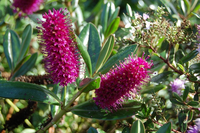 Hebe speciosa, communément appelée Veronica speciosa, est un arbuste persistant originaire de Nouvelle-Zélande appartenant à la famille des Scrophulariacées. Cet arbuste atteint généralement 1 à 2 mètres de hauteur avec un port compact et buissonnant. Il se caractérise par un feuillage dense, vert foncé et brillant, persistant toute l'année. Ses fleurs spectaculaires, de couleur violette à mauve, apparaissent en épis denses et décoratifs. Cette espèce est très appréciée pour sa floraison généreuse et prolongée, du mois de mai jusqu'aux premières gelées. Le nom du genre Hebe rend hommage à la déesse grecque de la jeunesse, reflétant la vitalité et la beauté de ces arbustes.