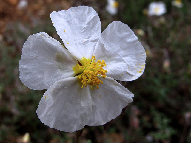 L'Hélianthème des apennins (Helianthemum apenninum) est une petite plante vivace de la famille des Cistacées, originaire des régions méditerranéennes et des chaînes montagneuses d'Europe du Sud, notamment les Apennins. Elle forme un buisson compact et étalé, atteignant généralement 20 à 40 cm de hauteur. Son feuillage persistant, fin et linéaire, présente une teinte grisâtre caractéristique. La plante se distingue par ses fleurs blanches délicates, parfois teintées de rose pâle, qui s'épanouissent de mai à juillet. Ces fleurs éphémères s'ouvrent en journée et se ferment en fin d'après-midi. L'Hélianthème des apennins prospère dans les habitats rocheux, les pentes ensoleillées et les garrigues méditerranéennes, où il s'adapte remarquablement aux conditions arides.