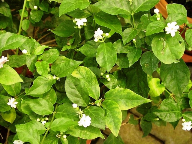Jasminum sambac, communément appelé jasmin d'Arabie ou jasmin sambac, est une plante grimpante volubile appartenant à la famille des Oleaceae. Originaire des régions tropicales et subtropicales d'Asie du Sud, elle se caractérise par un feuillage persistant vert foncé, composé de petites feuilles opposées et lancéolées. La plante produit des fleurs blanches intensément parfumées, petites et étoilées, disposées en petits bouquets floraux. Son port ramifié et flexible la rend particulièrement adaptée à la culture en espalier ou en pot. Avec une croissance vigoureuse, elle peut atteindre 2 à 3 mètres de hauteur selon les conditions de culture. Le jasmin sambac se distingue par sa floraison généreuse et prolongée, ainsi que par son arôme caractéristique très apprécié en parfumerie.