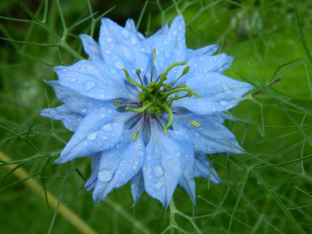 La Nigelle de Damas est une plante annuelle élégante de la famille des Ranunculacées, originaire du bassin méditerranéen et du Moyen-Orient. Elle se caractérise par un port dressé et aérien, atteignant généralement 40 à 60 cm de hauteur. Ses feuilles sont finement découpées, presque filiformes, créant une texture légère et vaporeuse très décorative. Les fleurs, simples ou semi-doubles selon les variétés, s'épanouissent de juin à octobre en teintes de bleu, blanc ou rose tendre. Chaque fleur est entourée d'une collerette de bractées finement dentées très remarquable. Après la floraison, des fruits globuleux gonflés apparaissent, particulièrement ornementaux. Cette plante se distingue par son apparence délicate et son cycle de vie court.