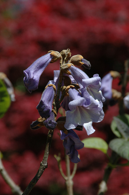 Le Paulownia tomentosa, communément appelé Paulownia ou Arbre de Paulownia, est un arbre caduc originaire de Chine et du Japon. Il se caractérise par un port érigé et une croissance très rapide, atteignant 12 à 15 mètres de hauteur. Ses grandes feuilles cordiformes, pubescentes et lobées, peuvent mesurer jusqu'à 25 cm, créant une silhouette imposante et architecturale. En avril-mai, il produit des fleurs tubulaires violettes à blanches, groupées en panicules dressées, exhalant un parfum sucré. Les fruits sont des capsules allongées contenant des graines ailées légères. Son bois léger et sa capacité à se régénérer rapidement en font une essence intéressante, mais son caractère envahissant l'a placé sur les listes des espèces problématiques dans certaines régions.