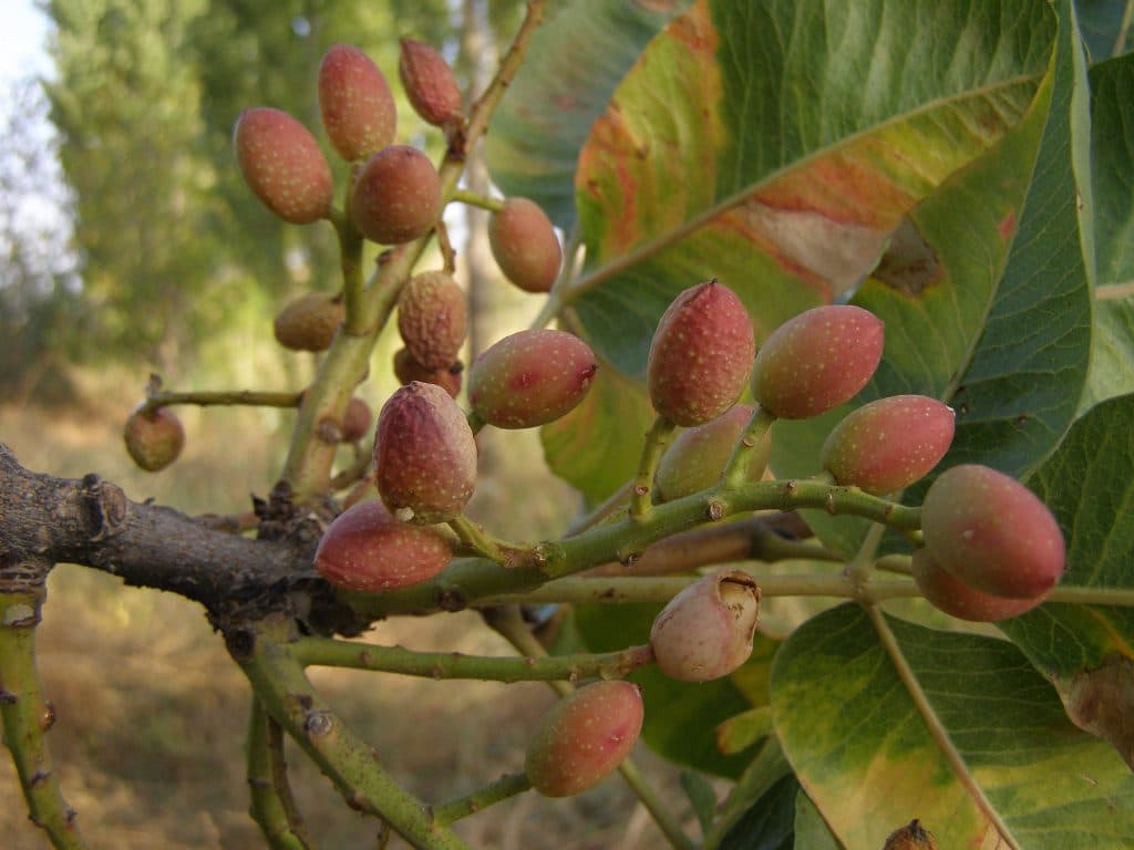 Le pistachier (Pistacia vera) est un arbuste ou petit arbre caduc de la famille des Anacardiaceae, originaire du Moyen-Orient et d'Asie centrale. Cet arbre au port étalé atteint généralement 8 à 10 mètres de hauteur. Il possède un feuillage persistant composé de petites folioles vert clair, qui vire au rougeâtre en automne. L'écorce grise et lisse du tronc contraste avec des rameaux épars. Le pistachier se distingue par ses grappes de petites fleurs verdâtres apparaissant en mai, suivies de fruits secs appelés drupes, contenant une graine comestible. Ces fruits présentent une coque dure de couleur beige et crème à maturité, enfermant un noyau verdâtre caractéristique qui ne se développe que sous certaines conditions climatiques favorables.