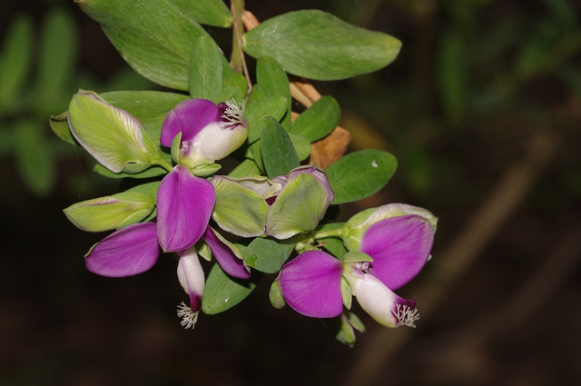 Polygala myrtifolia, communément appelée Polygale à feuilles de myrte, est un arbuste persistant de la famille des Polygalaceae. Originaire d'Afrique du Sud, cet arbrisseau atteint généralement 1 à 2 mètres de hauteur. Il se caractérise par un feuillage dense et linéaire, rappelant effectivement celui du myrte, d'où son nom spécifique. La plante revêt une grande valeur ornementale grâce à ses fleurs en grappes denses d'un violet vibrant, apparaissant de mai à octobre. Son port compact et buissonnant en fait une espèce prisée pour les jardins méditerranéens et les régions à climat tempéré chaud. L'arbuste préfère les expositions ensoleillées ou partiellement ombragées et s'adapte à des sols variés pourvu qu'ils soient bien drainés.