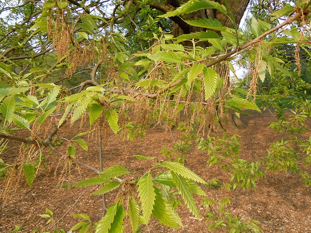 Quercus castaneifolia, le chêne à feuilles de châtaignier, est un arbre caduc de la famille des Fagacées originaire du Caucase et des régions du sud-ouest asiatique. Il atteint généralement 20 à 25 mètres de hauteur avec un port étalé et ramifié. Cet arbre se distingue par ses feuilles caractéristiques, longues et dentées, rappelant celles du châtaignier, d'où son nom vernaculaire. L'écorce est profondément crevassée et grise. Les fleurs apparaissent en avril-mai sous forme de chatons discrets, typiques du genre Quercus. Les fruits sont des glands contenus dans des cupules hérissées. C'est une essence forestière rustique bien adaptée aux régions tempérées, capable de prospérer dans divers types de sols.