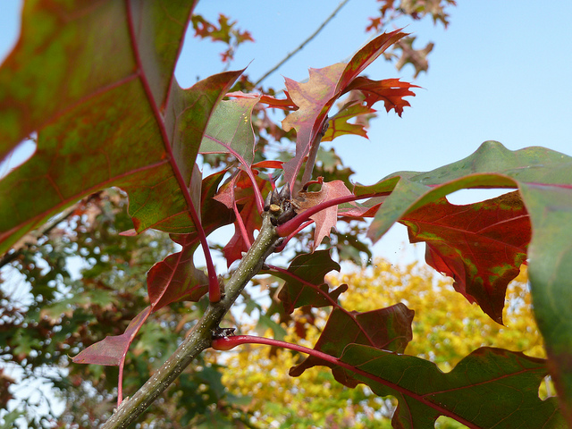 Quercus shumardii, le chêne de Shumard, est un grand arbre caduc de la famille des Fagacées, originaire du sud-est des États-Unis. Il peut atteindre 20 à 30 mètres de hauteur avec un port érigé et une couronne dense. Cet arbre se distingue par ses feuilles profondément lobées, d'un vert lustrant en été, qui virement au rouge-orangé à l'automne, offrant un spectacle ornemental remarquable. L'écorce est lisse grisâtre quand l'arbre est jeune, devenant plus épaisse avec l'âge. Il produit des fleurs discrètes jaunes en mars, avril et mai, suivies de glands caractéristiques des chênes rouges. Le chêne de Shumard prospère dans les régions subtropicales et tempérées chaudes, où il colonise naturellement les forêts de plaines alluviales et les zones humides.
