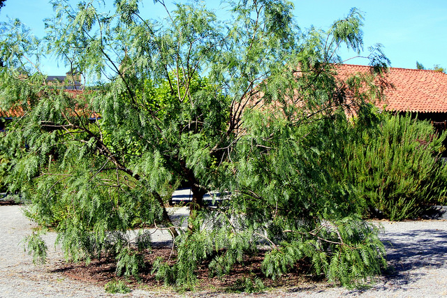 Le Schinus molle, communément appelé faux poivrier, est un arbre de taille moyenne originaire d'Amérique du Sud, particulièrement des régions andines du Pérou et du Chili. Cet arbre persistant peut atteindre 15 à 20 mètres de hauteur avec un port étalé et gracieux. Son feuillage composé, pennées et finement divisé, confère une légèreté caractéristique à la couronne. L'écorce grisâtre et fissurée devient progressivement caverneuse avec l'âge. Ses petites fleurs blanc-jaunâtre apparaissent au printemps (avril à juin) en panicules denses, suivies de fruits rouges puis noirs de la taille d'un pois, ressemblant à des grains de poivre. Appartenant à la famille des Anacardiaceae, cette espèce partage certaines caractéristiques avec le pistachier et le manguier, bien que moins sensible aux maladies.