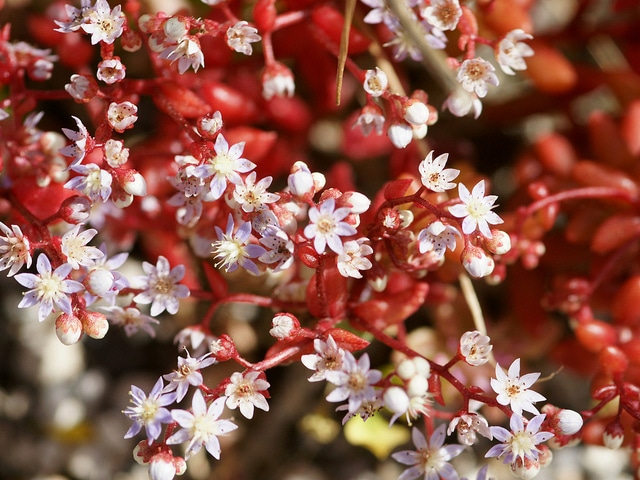 Sedum caeruleum, l'Orpin bleuâtre, est une plante annuelle succulente appartenant à la famille des Crassulacées. Cette petite espèce herbacée atteint généralement 10 à 20 cm de hauteur, formant des rosettes compactes de feuilles charnues et arrondies. Son feuillage caduc présente une teinte bleu-gris caractéristique, particulièrement marquée en conditions ensoleillées. Originaire des régions méditerranéennes et du Moyen-Orient, cette espèce s'est adaptée aux milieux secs et rocheux. Les tiges sont rougeâtres à pourpres, ajoutant à son attrait ornemental. Contrairement à la plupart des Sedum vivaces, cette espèce complète son cycle en une seule année, ce qui la rend plus fragile face aux variations climatiques.