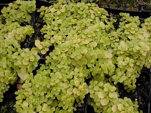Sedum makinoi est une petite plante vivace succulente appartenant à la famille des Crassulacées, originaire d'Asie de l'Est. Cette espèce se caractérise par un port tapissant et compact, formant des tapis denses de quelques centimètres de hauteur seulement. Ses feuilles sont petites, arrondies, charnues et vert clair, persistantes toute l'année, ce qui en fait une plante ornementale attrayante même hors floraison. En juillet et août, elle produit de minuscules fleurs blanc-rosé regroupées en petites inflorescences étoilées. Sedum makinoi prospère naturellement sur les roches, les talus et les zones montagneuses, où elle s'adapte à des conditions difficiles. Sa structure compacte et son feuillage persistant la rendent particulièrement appréciée pour les jardins de rocaille, les toitures végétalisées et les compositions en conteneurs.