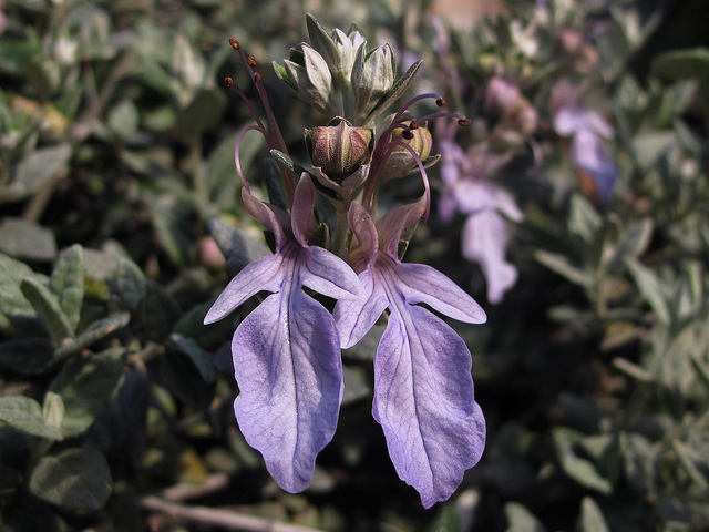 Teucrium fruticans, appelée germandrée arbustive, est un petit arbuste méditerranéen appartenant à la famille des Labiatae (Lamiaceae). Originaire du pourtour méditerranéen, notamment d'Afrique du Nord et du Moyen-Orient, c'est une plante vivace à feuillage persistant de petite à moyenne taille, généralement entre 60 et 120 cm de hauteur. Elle possède une port buissonnant et compact, avec des tiges lignifiées ramifiées finement. Les feuilles sont petites, étroites, linéaires à lancéolées, d'un vert grisâtre, typiques des plantes adaptées aux régions sèches. La germandrée arbustive produit de délicates fleurs bleu pâle à bleu violet, regroupées en petits épis, qui apparaissent de mai à juillet. C'est une plante très ornementale, reconnaissable à son port gracieux et ses fleurs élégantes.
