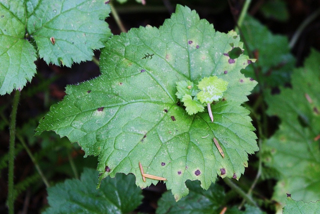 La Tolmie de Menzies (Tolmiea menziesii) est une plante vivace herbacée appartenant à la famille des Saxifragacées. Originaire des régions côtières du Pacifique Nord-Ouest, elle se caractérise par un feuillage persistant, vert, avec des feuilles palmées et lobées présentant des nervures marquées. Cette plante reste compacte, atteignant généralement 30 à 60 cm de hauteur. Elle produit des fleurs discrètes mais élégantes en mai et juin, présentant des tons violets et bruns qui ornent gracieusement la plante. Particulièrement remarquable, elle développe naturellement de petites plantules sur ses feuilles, lui conférant un aspect unique. Elle pousse naturellement en sous-bois humide et ombragé, dans les zones rocheuses et près des cours d'eau.