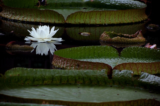 Victoria cruziana, le nénuphar géant, est une plante aquatique spectaculaire de la famille des Nymphaeaceae. Originaire d'Amérique du Sud, notamment des régions tropicales du Paraguay et du Brésil, cette espèce annuelle se distingue par ses feuilles flottantes gigantesques pouvant atteindre 2 à 3 mètres de diamètre. Les feuilles rondes et ondulées, dotées d'un revers rougeâtre caractéristique, possèdent une structure de nervures épaisses qui les rendent extraordinairement robustes et flottantes. Les fleurs blanches à délicates, s'épanouissant la nuit, se déploient entre les feuilles monumentales. Cette plante annuelle croît rapidement en eaux calmes et peu profondes, formant des colonies denses dans son habitat naturel.